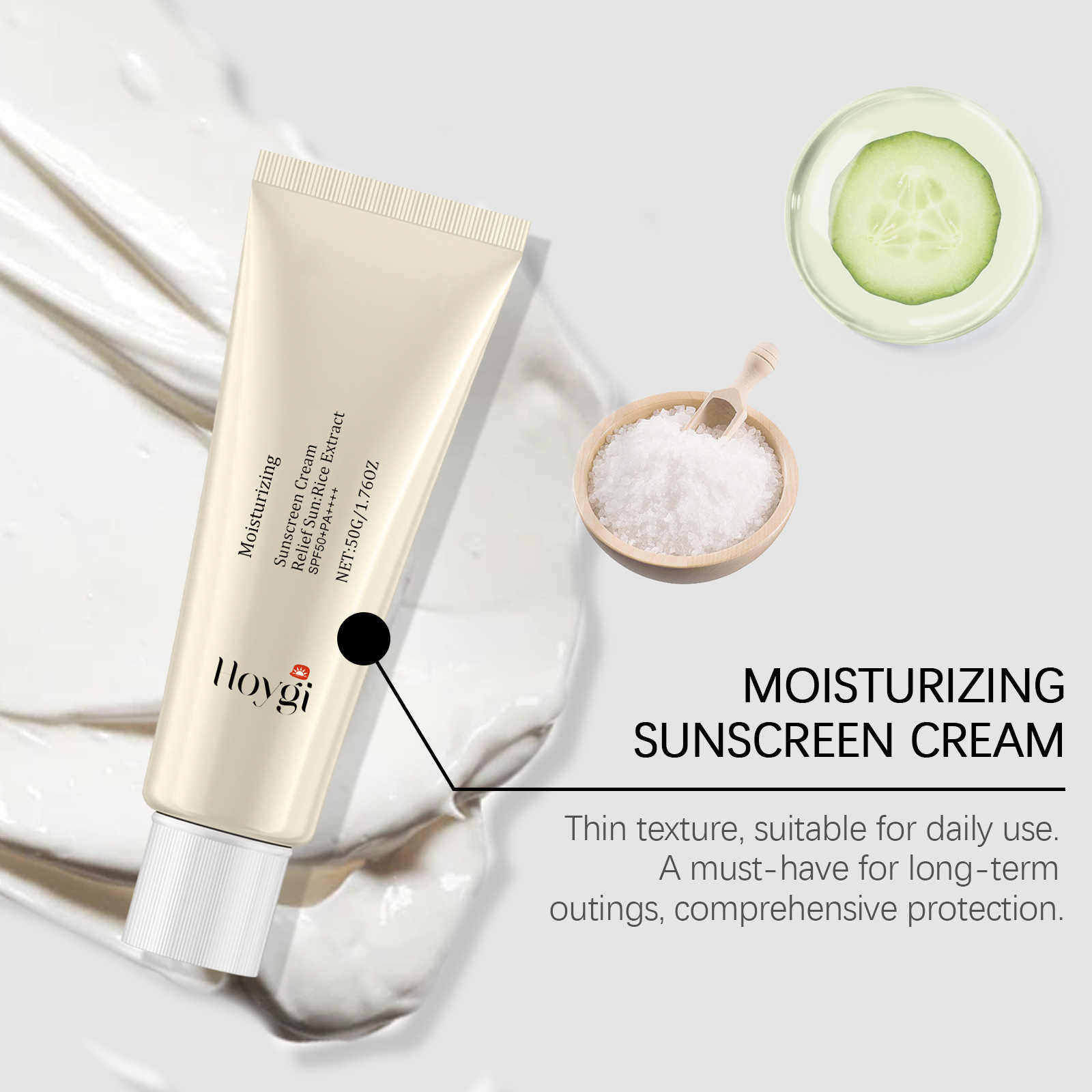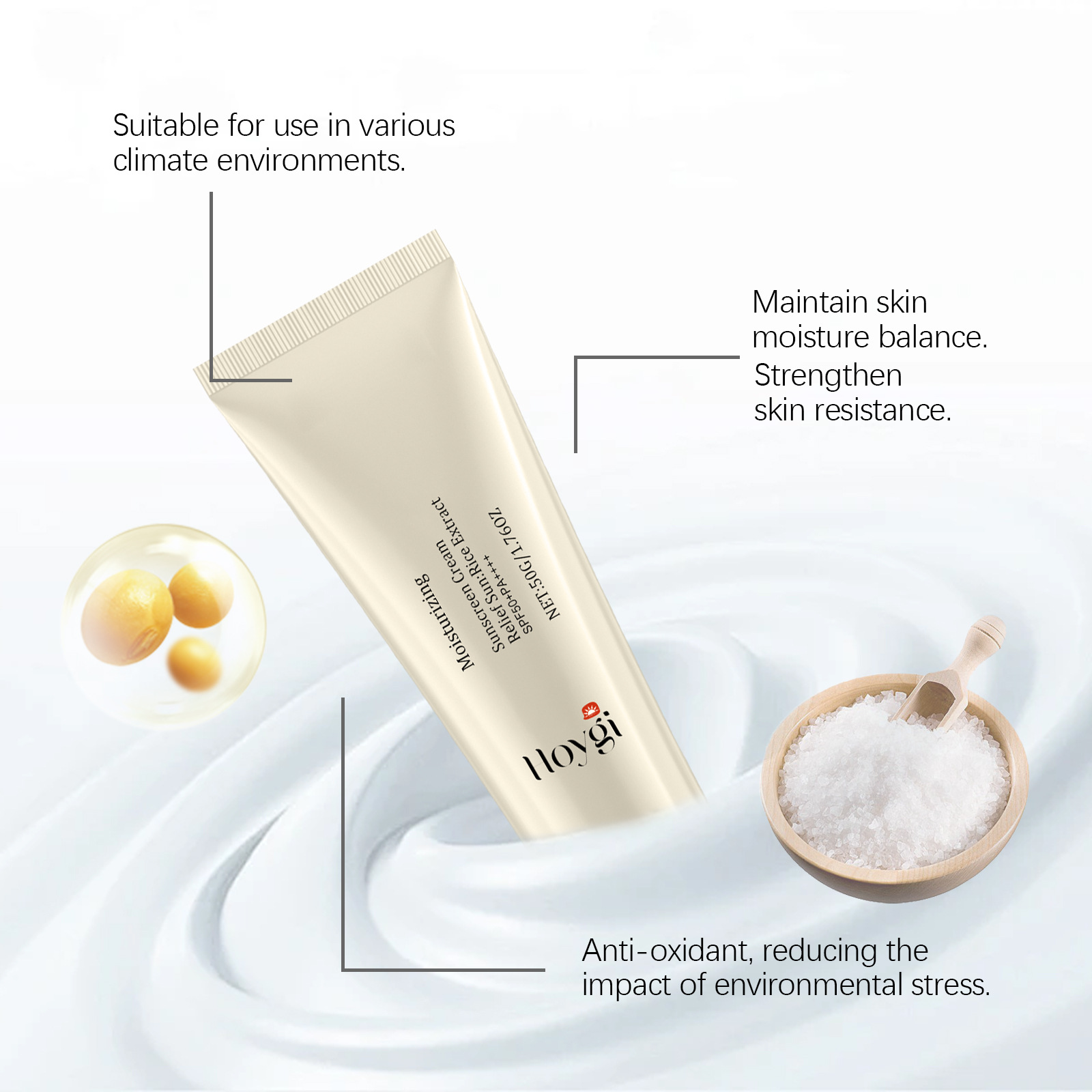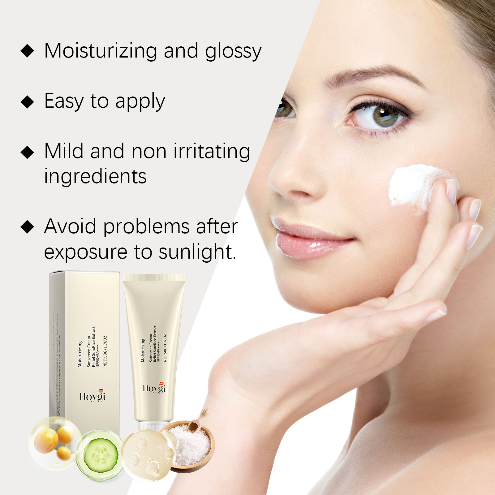 Our moisturizing and protective cream contains titanium dioxide and cucumber extract. It can deeply lock in moisture and keep the skin soft. Its usage is simple: after cleansing, take an appropriate amount of sunscreen and apply it evenly to the face, neck, and other areas that need sun protection. Gently massage until fully absorbed, avoiding contact with the eye area. And it can soothe the skin and strengthen its protective barrier. Improve skin quality and enhance overall skin radiance.